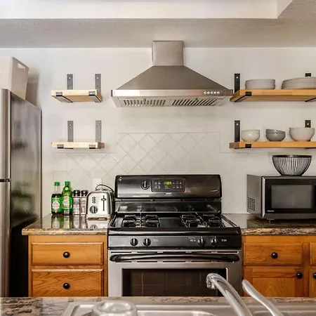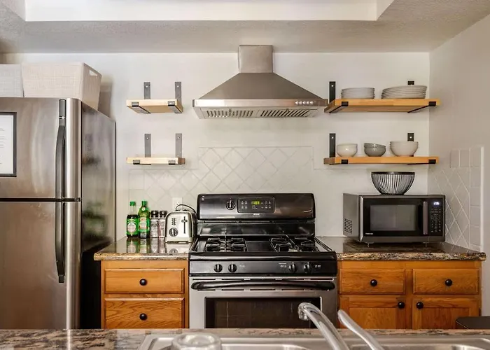 このアパートには設備の整った台所も備わっています。 この宿泊は、Slide Mountain Baseケーブルカー駅から歩いて10分くらいです。